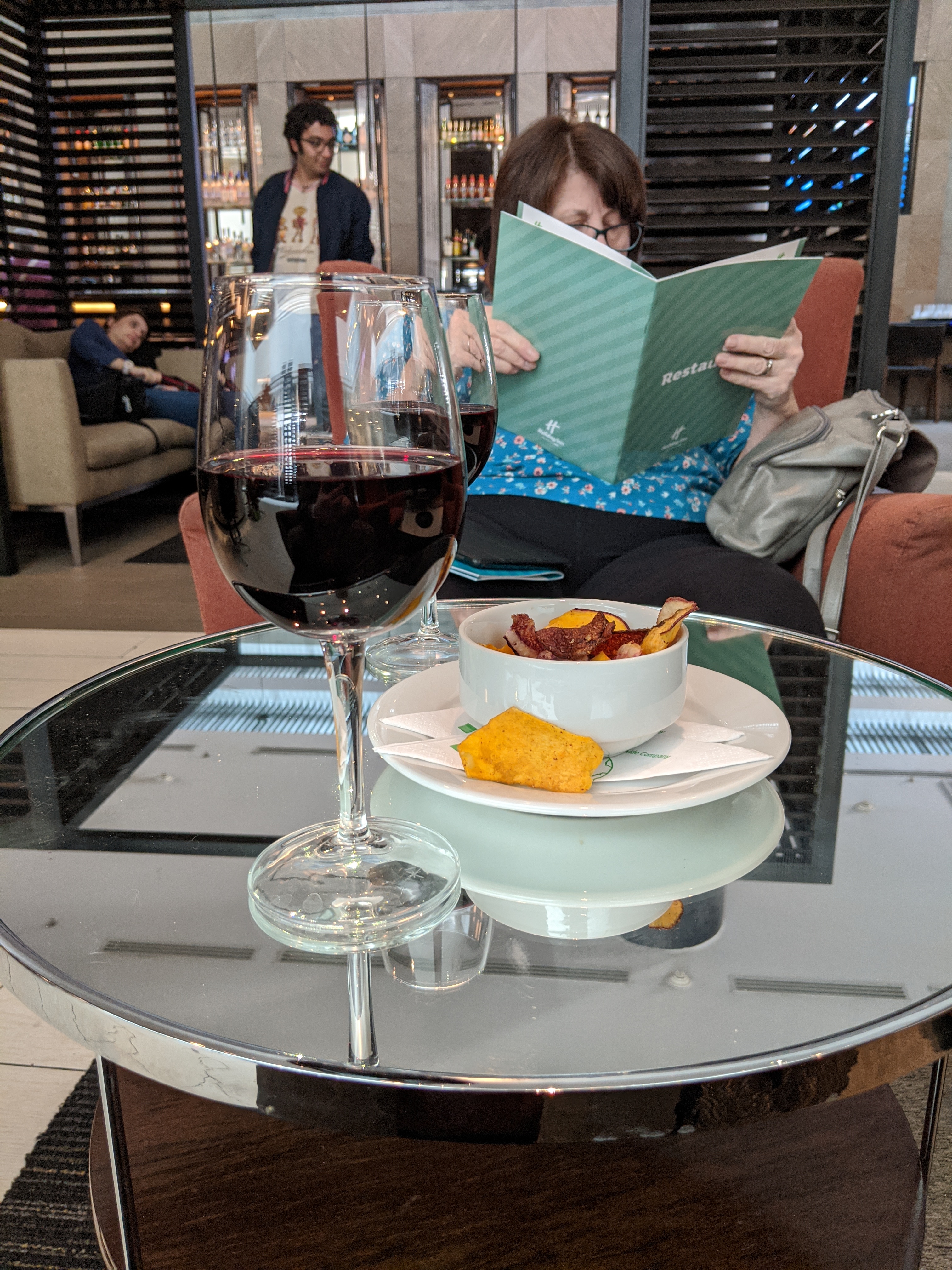 Relaxing at the Holiday inn Express Lounge, enjoying Malbec and Empanadas