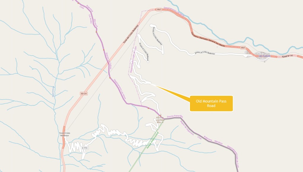 The serpentine switchback dirt road leading to the top of Uspallata Pass