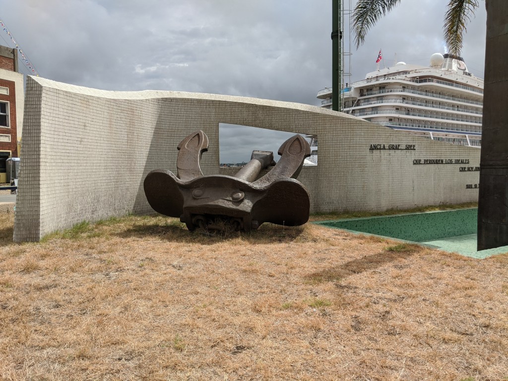 As you leave the gated port facilities there is a monument with one of the anchors and a range-finder from the German pocket Battleship Graf Spee, which was scuttled off Montevideo in 1939. This was one of the first naval battles of World War 2 when Royal Navy warships damaged the Graf Spee in what would be called the Battle of the River Plate. The German Captain sought refuge in neutral Uruguay to do repairs and transfer his wounded for medical care. Under neutrality rules, the Graf Spee could only stay in Uruguay’s neutral waters for 72 hours. The Captain decided to scuttle the ship rather than steam out into the British ambush. Thousands lined the shores of Montevideo to watch the battleship blow up. Many artifacts were recovered over the years and many displayed at the Uruguay Naval museum.
