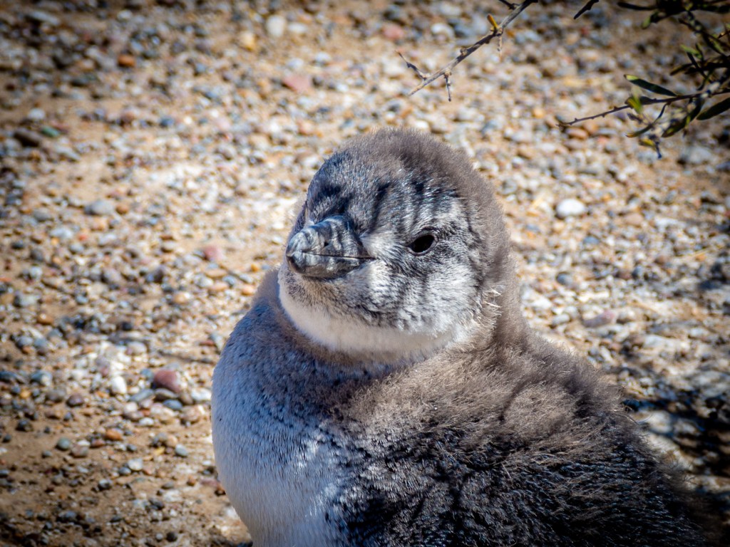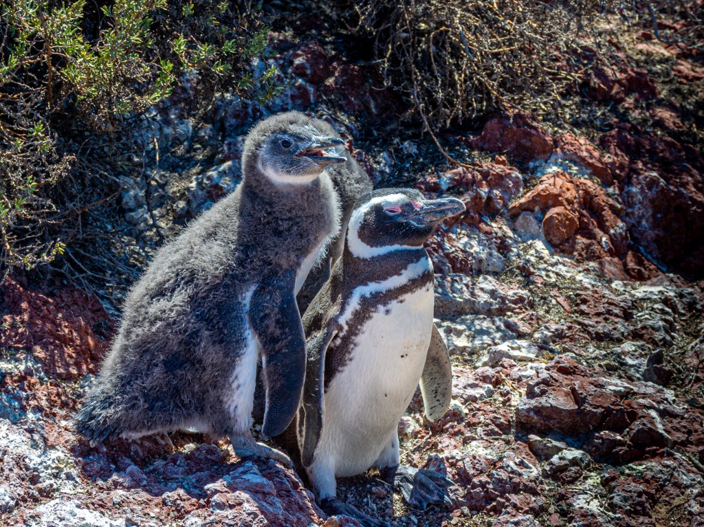 Magellanic Penguins mate for life and always return to the same nest. The nests here are either shallow burrows in the sand or under thick bushes. The mating pairs separate during the northerly migration and when they return in the Fall, find each other by their unique calls. The juveniles have “fluffy” feathers.