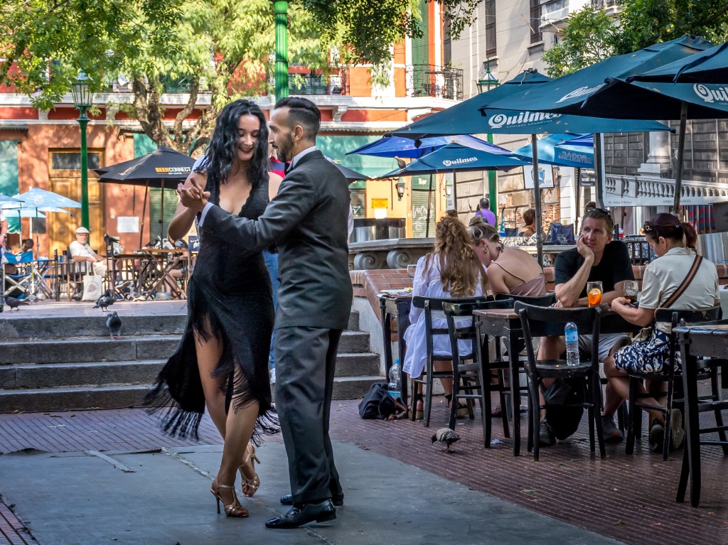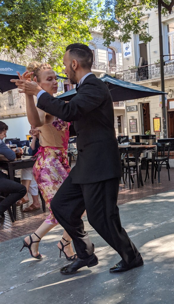 By mid-afternoon we headed back to the hotel. At Plaza Dorrego, the nearby restaurants had tables set up under the plaza trees so we decided to get some lunch. A good asado (steak) was in order along with some Malbec. Tango dancers from the nearby clubs were performing right next to our table, so we enjoyed a long lunch immersed in the Argentine Tango experience. Quiet a classy way to end our day.