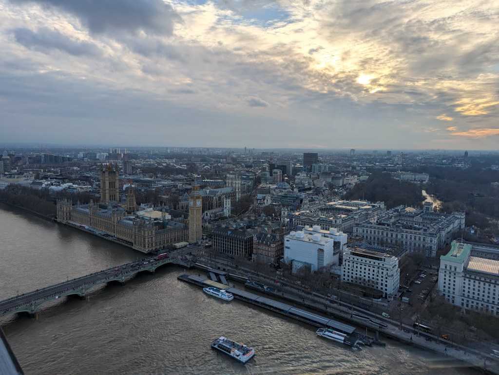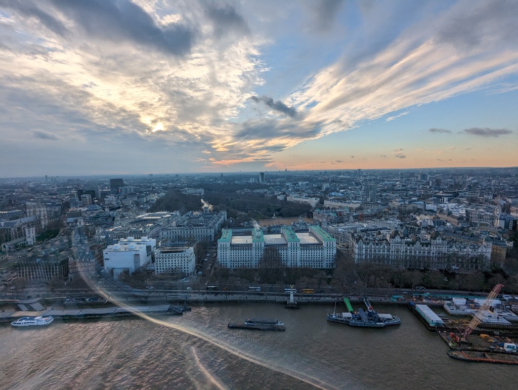 Late afternoon we walked from our hotel, Conrad St. James in Westminster to the Eye, about 20 minutes walk. It was cloudy and cold and had been raining and snow showers earlier. We got the The Eye at about 5:15pm and the sky was brightening, we had no wait, right on board our pod and away we went, about 30 minutes to go around and what views!